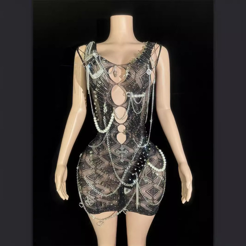 Ocstrade Ceinture Clou Boucle Perle Chaîne Sexy Noir Mini Robe pour Femmes Party Club Night Mesh See Through Ballroom Performance Wear